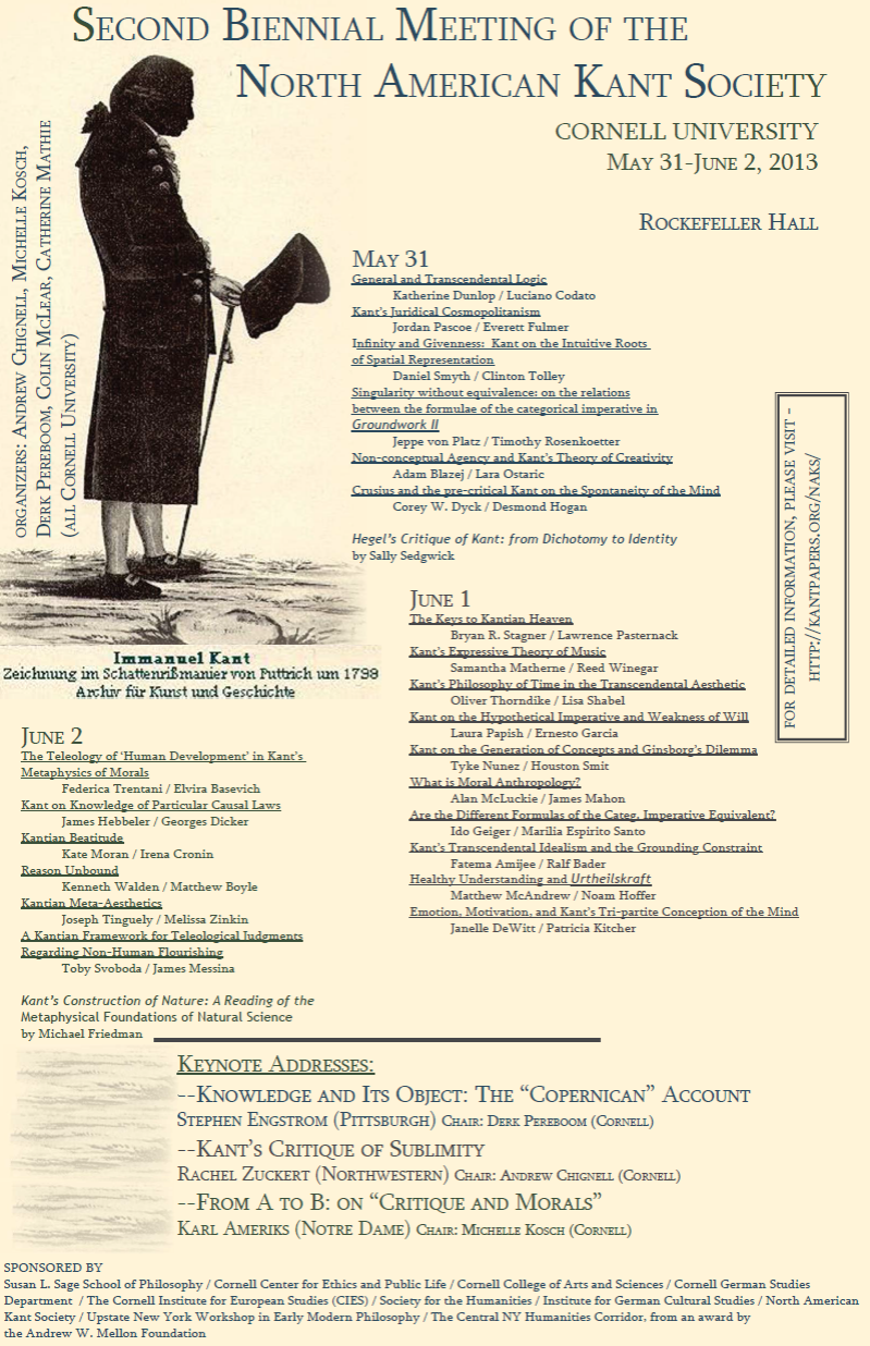 The conference will be held at Cornell University on May 31–June 2, 2013. Papers will cover all areas of Kant's philosophy.